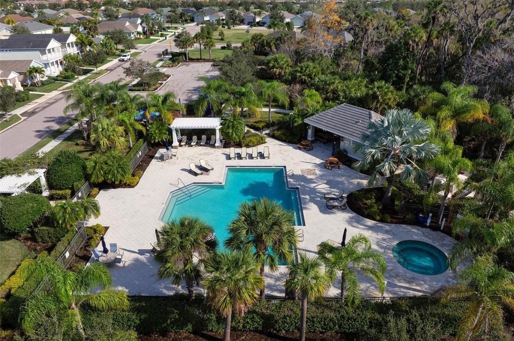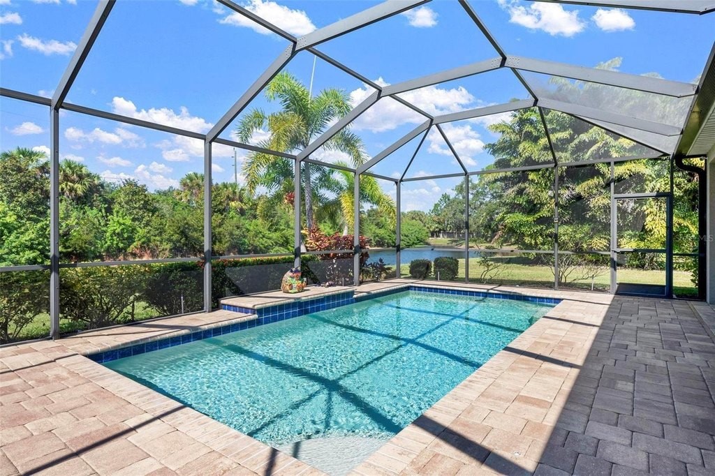 Immaculate and move-in ready! Stunning POOL home that lives LIKE NEW! Built by award-winning Neal Communities in 2016, this beautifully maintained 3-bedroom plus DEN residence is nestled within the gated community of Woodbrook. Welcoming covered front entry leads into the spacious foyer. Bright, open great room layout with neutral and timeless design throughout; tray ceiling, recessed lighting, and Hunter Douglas window treatments. Sliding doors open to an extended screened lanai with bronze enclosure, heated inground pool, stone paver deck, and covered seating area with ceiling fan and gas hook-up, perfect for effortless indoor-outdoor living. Inviting kitchen features shaker-style cabinetry with crown molding, dual granite countertops, tile backsplash, GE stainless steel appliances with gas cooking, center island with counter-height seating, and a spacious walk-in pantry. Serene primary suite offers a large walk-in closet and ensuite bath with tiled walk-in shower and dual vanities. Two additional bedrooms share a well-appointed full bath. A versatile den with French doors provides the ideal home office, media room, or playroom. Additional highlights include a large indoor laundry room with GE washer and dryer, multiple storage closets, and a two-car garage with epoxy coating on floor. Furnishings available under separate contract. Enhanced landscaping and a wider right side yard give you privacy. Palm Leaf Court is a small circle of 8 homes with landscaped center. Residents of Woodbrook enjoy a resort-style heated pool and spa, cabana, outdoor grill area, playground, park, and scenic walking trails. Conveniently located near UTC shopping, fine dining, cultural attractions, downtown Sarasota and Bradenton, pristine Gulf beaches, top-rated golf courses, and Sarasota-Bradenton International Airport. Comfort and style – all just minutes from everything you need.